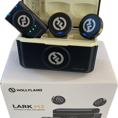 Lavalier Funkmikro mit zwei Sendern, einem Empfänger und einer Ladeschale
