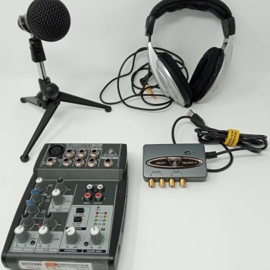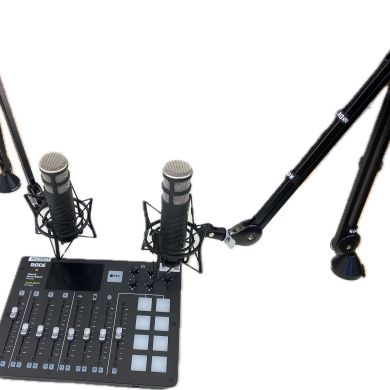Podcastmischpult mit zwei hochwertigen Rode - Mikrofonen, Stativen, Kopfhörer und anschaulicher Kurzanleitung