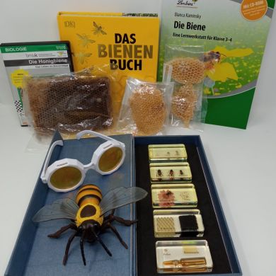 Ein Tiermodell und die im Koffer enthaltenen Materialien veranschaulichen Körperbau und Lebenszyklus der Honigbiene und geben Einblick in die Lebensweise im Bienenstaat, zum Bienenvolk, Honigherstellung und Imkerei.