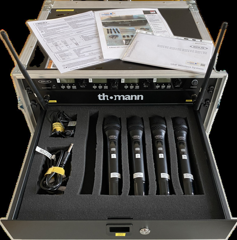 Das Sirus Quad R ist ein Komplettset, das aus vier Hand-Funkmikros und dem passenden Empfänger besteht. Das Set ist in einem praktischen Tragecase eingebettet, wodurch ein unkomplizierter und schneller Transport sowie Aufbau ermöglicht wird. Die passenden Akkus, benötigten Kabel und eine Bedienungsanleitung sind natürlich auch mit an Bord.