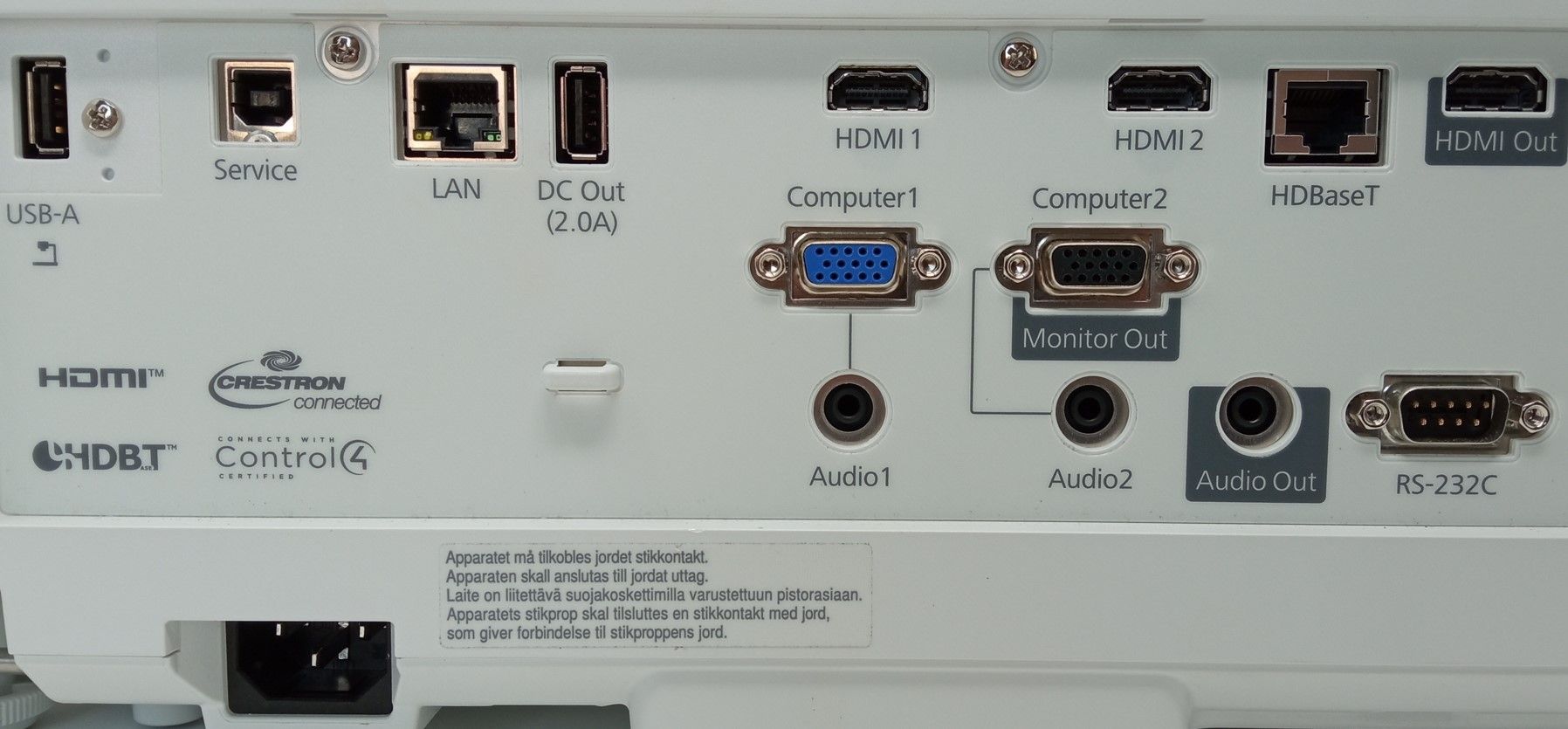 USB2.0-A, USB 2.0, RS-232C, Ethernet-Schnittstelle (100 Base-TX/10 Base-T), WirelessLAN, IEEE 802.11 a/b/g/n/ac, WLAN b/g/g 25 GHz, Wireless-LAN a/n (5GHz), VGA-Eingang 2x, VGA-Ausgang, HDMI-Ausgang, HDBaseT, Miracast, Klinkenstecker, Klinkenbuchse 2x, HDMI (HDCP 2.3(2x), Wiedergabe für USB 2, Typ A, Smartphone-Verbindung: Ad-Hoc/Infrastruktur