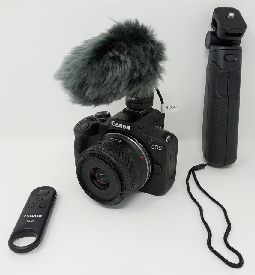 Systemkamera mit Objektiv RF-S18-45mm F4.5-6.3 IS STM und Objektivdeckel, 32 GB SD-Karte, Schultergurt, Ladegerät mit Akku Canon LP-E17 und Netzkabel, Stereomikrofon DM-E100 mit Windschutz, Stativ-Griff HG-100 TBR mit drahtloser Fernbedienung und Mikrofonhalter L und Mikrofonhalter S, Handbuch zur Kamera, Anleitung Mikrofon, Anleitung Stativ