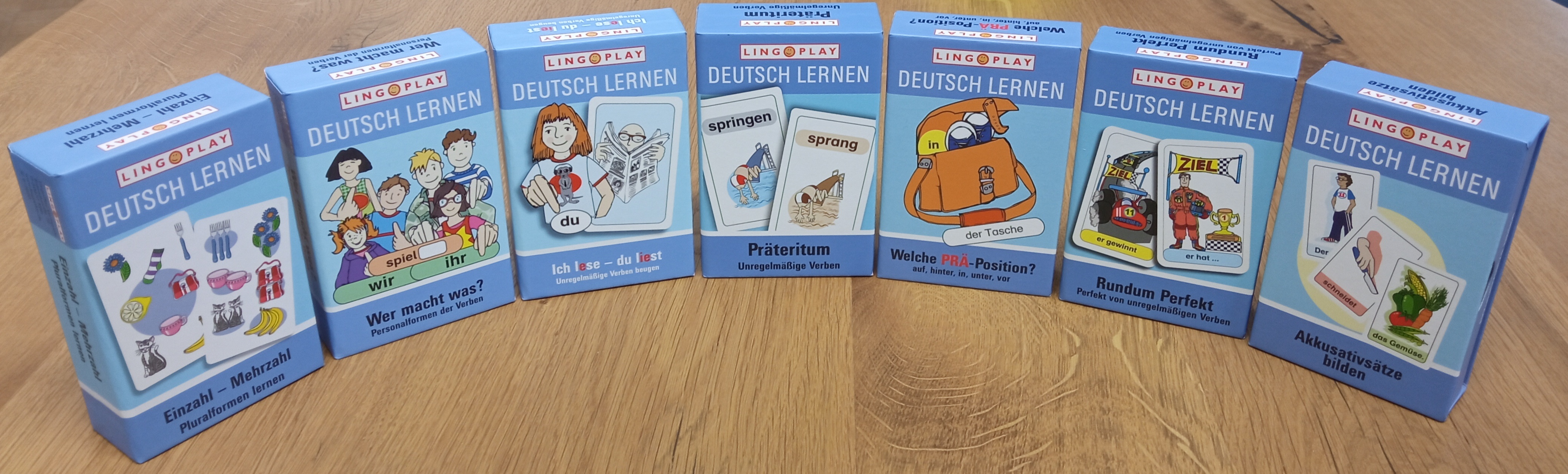 - einfache Sätze mit Akkusativobjekt bilden - Verbzweitstellung beachten - häufig gebrauchte regelmäßige Verben - unregelmäßige Verben beugen - Verben richtig beugen lernen - Perfekt von unregelmäßigen Verben bilden - Präpositionen „auf“, „hinter“, „in“, „unter“, „vor“ - Präteritum von unregelmäßigen Verben bilden - alle Personalformen: 1., 2. und 3. Person Singular und Plural - Zeitformen Präsens und Perfekt erkennen - Pluralformen lernen