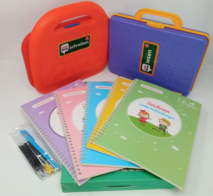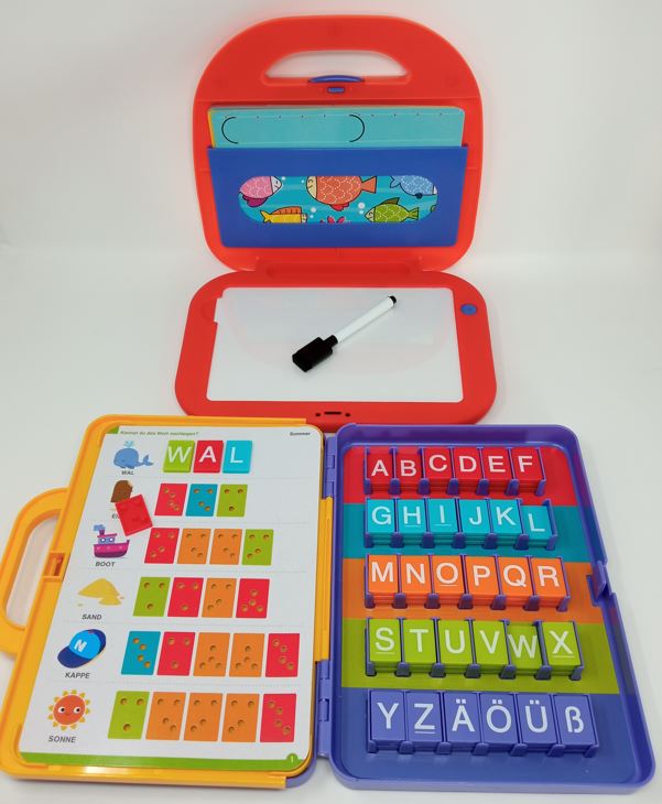⦁ Magisches Buch zum Lernen des Schreibens (5 Bücher mit folgenden Themen: Zahlen 0 - 100, Addition und Division, Multiplikation und Subtraktion, Alphabet, Zeichnen) ⦁ Jumbo - Sprachspiel: Ich lerne Lesen (90 Übungen in 3 Schwierigkeitsstufen: Buchstaben erkennen, erste Worte lesen, Buchstabieren, Wortschatz erweitern) ⦁ Jumbo - Sprachspiel: Ich lerne Schreiben (94 Übungen in 5 Schwierigkeitsstufen: Feinmotorik entwickeln, Auge - Hand - Koordination verbessern, erste Buchstaben und Wörter schreiben, Wortschatz erweitern)