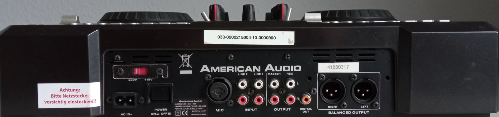 Das Backpanel bietet neben zwei Cinchbuchsen auch zwei symmetrische XLR-Ausgänge zum Ausführen des Mastersignals in die PA. Der Recording Out wird unabhängig von der Master-Lautstärke aufgezeichnet. Zudem gibt es einen koaxialen Digitalausgang (S/PDIF). Für jeden der beiden Mischpultkanäle steht ein Paar Cinch-Eingänge zur Verfügung.