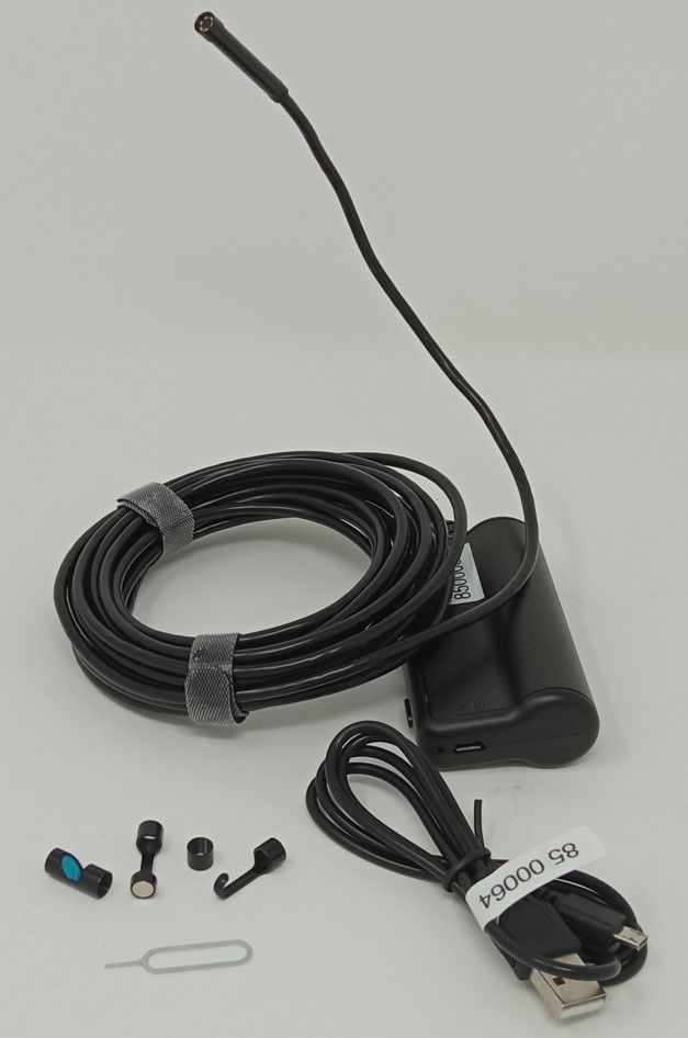 Zubehör: Wasserdichte Endoskopkamera mit WiFi-Box, USB-A-Micro-USB-Kabel, 2 x  Anleitung, Kleinzubehör im Röhrchen: Seitenspiegel, Haken, Magnet