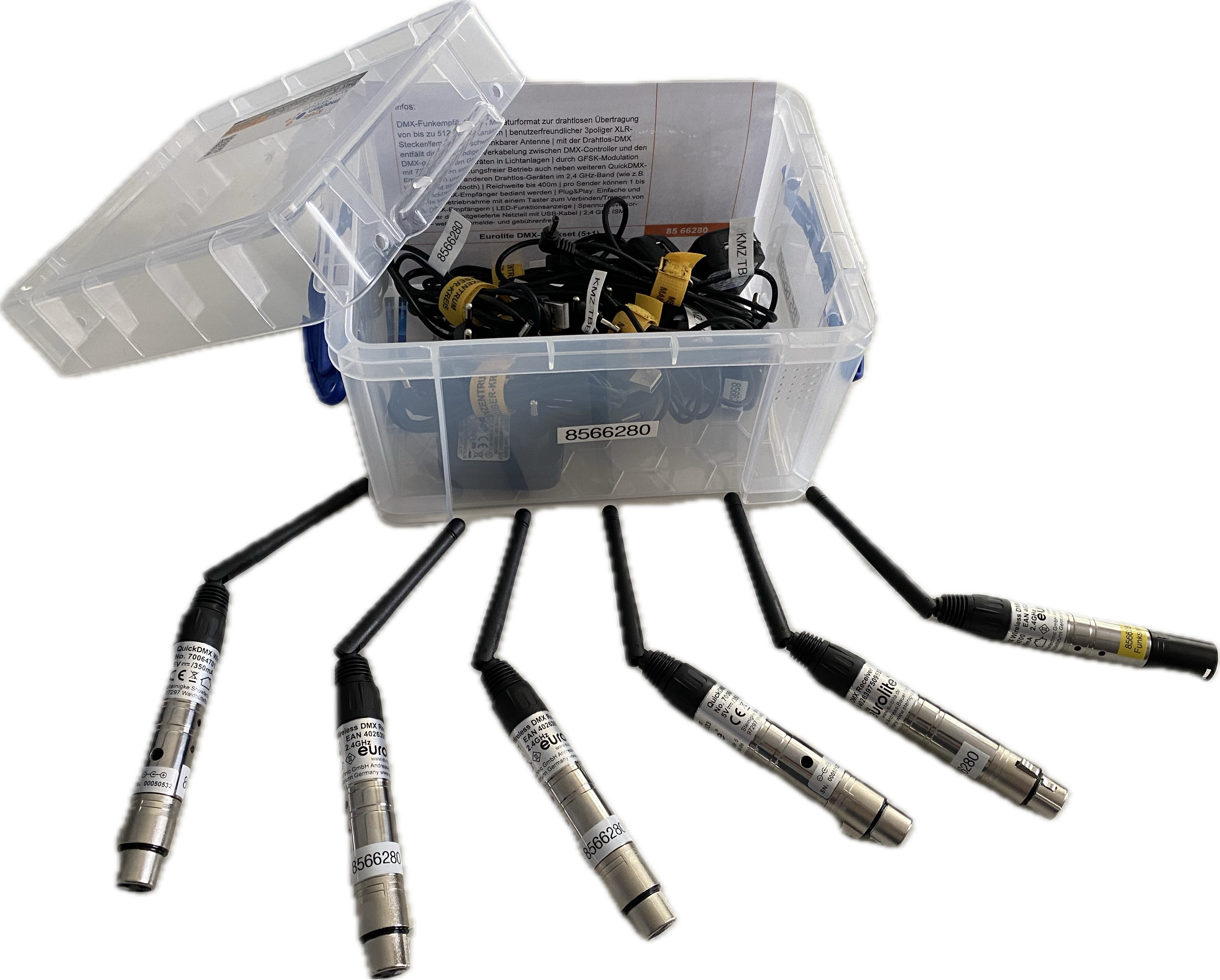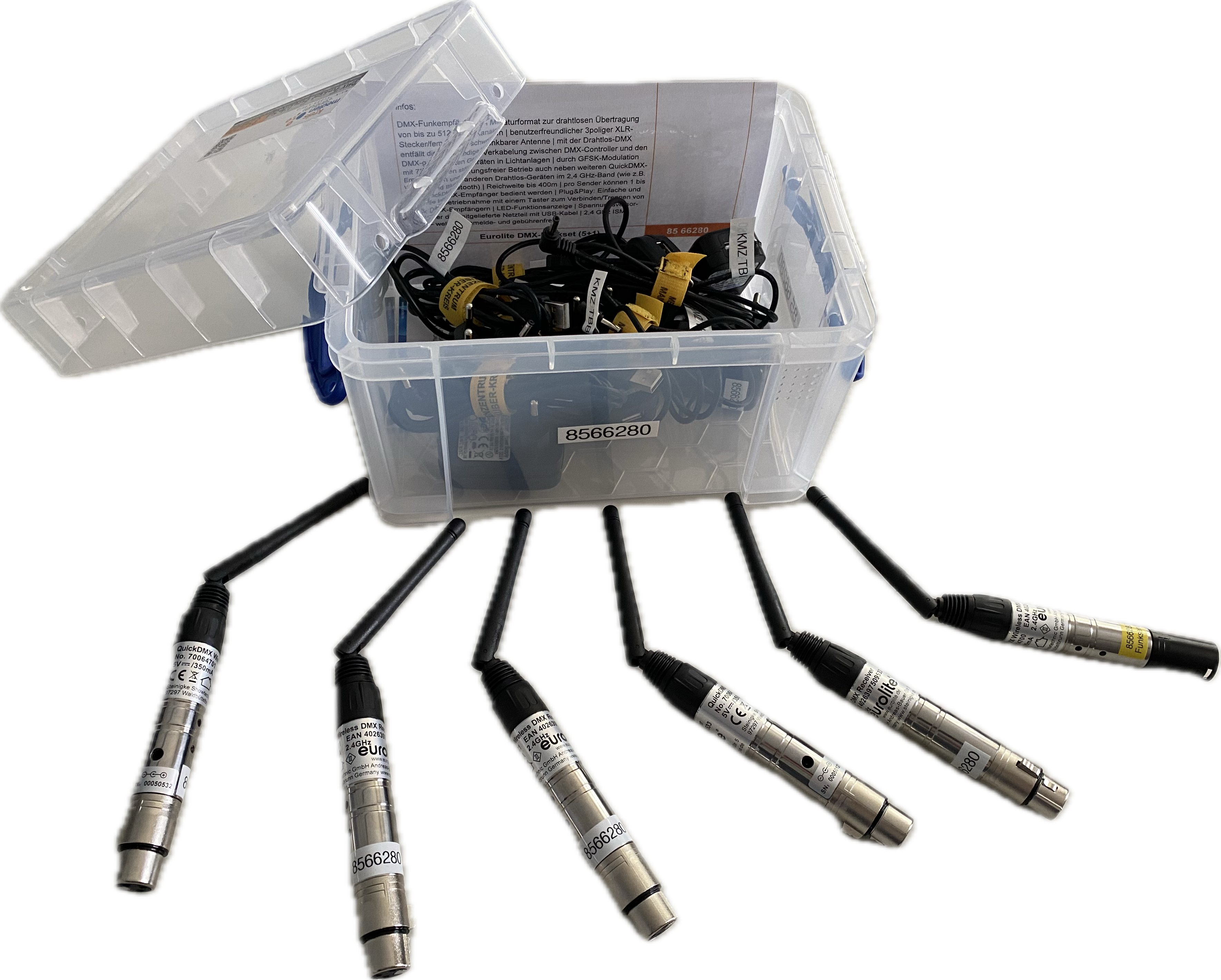5x Quick DMX-Funkempfänger (=3poliger XLR-Stecker/female mit schwenkbarer Antenne), 6x Netzstecker mit USB-Kabel zur Spannungsversorgung, 1x Kurzanleitung, 1x Quick-DMX-Funksender (=3poliger XLR-Stecker/male mit schwenkbarer Antenne)