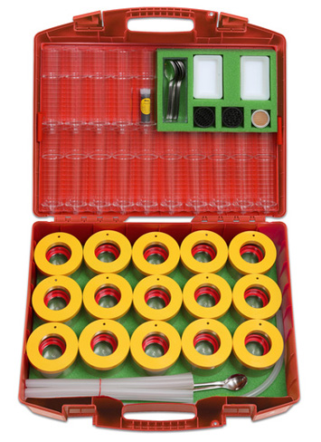 Kunststoffbecher mit Graduierung, Keimschalen, Metalllöffel, Verbindungsschläuche (transparent), Färbemittel (Lebensmittelfarbe)
