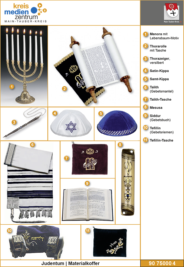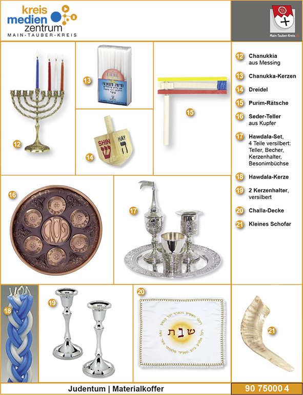 Das Judentum kennt viele Rituale und Symbole. Zum ganzheitlichen und anschaulichen Lernen beinhaltet der Materialkoffer wichtige rituelle Gegenstände zur Annäherung an diese alte aber lebendige Religion. Zu allen bedeutenden jüdischen Festen sind die wichtigen rituellen Gegenstände mit Kurzbeschreibung vorhanden, wie beispielsweise ein Schofarhorn für Rosch Haschana und Jom Kippur, Chanukka-Leuchter und Dreidel für Chanukka, eine Rätsche für Purim und ein Sederteller für Pessach.