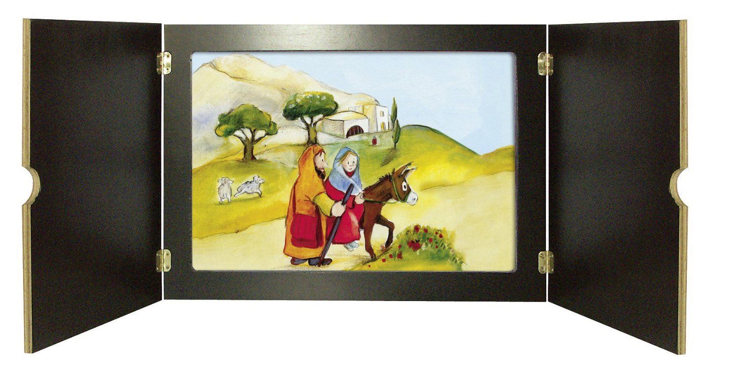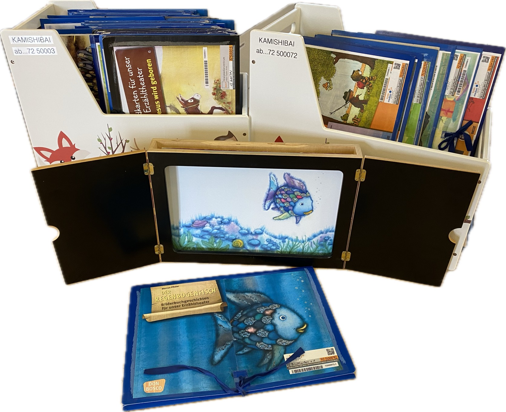 Tragbares, ursprünglich aus Japan stammendes Erzähltheater. Der Geschichtenerzähler schiebt seine Bilder in den Holzrahmen und beginnt, Bild für Bild zu erzählen. Fertige Bildkartensets zu verschiedenen Geschichten und Märchen gibt es im Verleih des KMZ. Aber auch selbst gemalte DIN A3-Bilder zum Geschichtenerfinden passen ebenso in den großzügigen Bühnenraum.