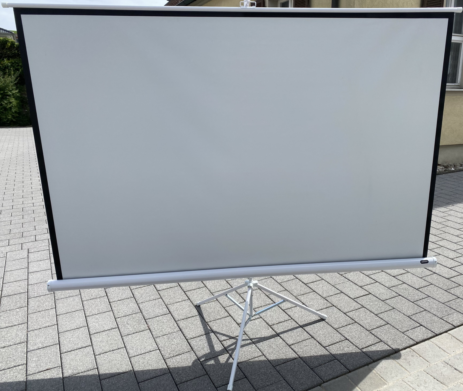 Die Leinwand hat die quadratische Fläche von 2,20m x 2,20m und lässt sich innerhalb einer Minute aufbauen. Transportiert wird sie zusammengerollt in einer praktischen Tragetasche, deren Packmaß 2,36m (Länge) beträgt.