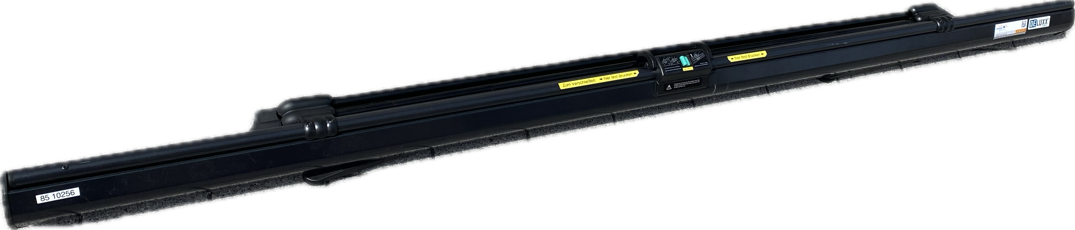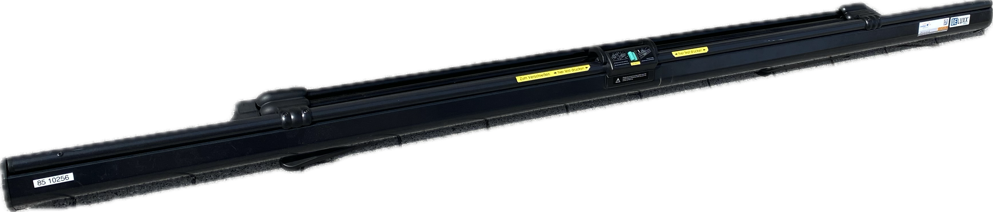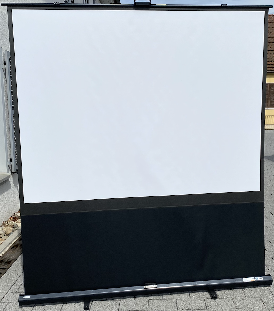 Die Leinwand befindet sich in einem praktisch zu transportierenden Aluminiumgehäuse und lässt sich im Handumdrehen ausrollen. Die sichtbare Fläche beträgt 203 x 152 cm und wird von einem 3 cm schwarzen Rand links, rechts und oben begrenzt.