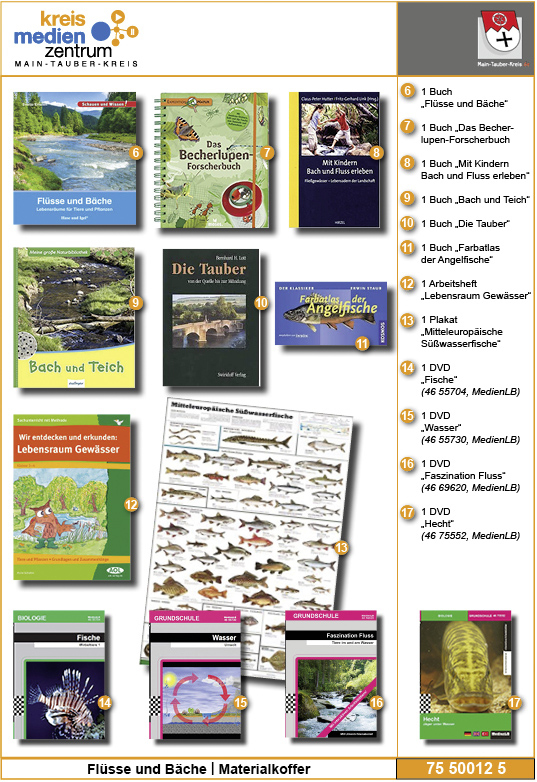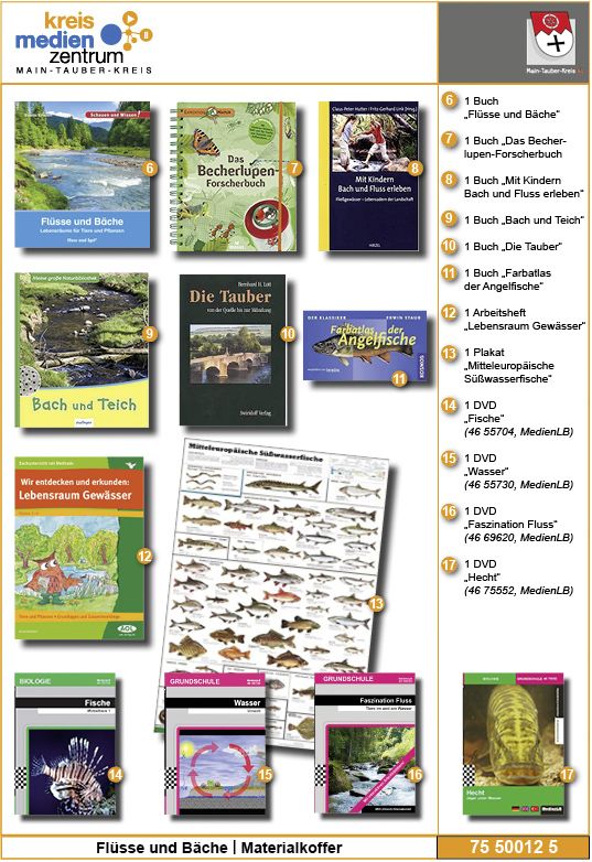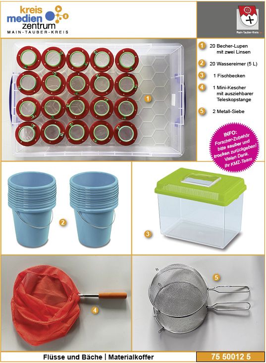 Der Materialkoffer besteht aus: 1.) Medienbox: - 1 Buch „Expedition Natur. Das Becherlupen-Forscherbuch: Aktiv die Natur entdecken!“ - 1 Buch „Meine große Naturbibliothek: Bach und Teich“ - 1 Buch „Mit Kindern Bach und Fluss erleben: Fließgewässer – Lebensadern der Landschaft“ - 1 Buch „Schauen und wissen!: Flüsse und Bäche – Lebensräume für Tiere und Pflanzen“ - 1 Buch „Die Tauber – von der Quelle bis zur Mündung“ - 1 Buch „Farbatlas der Angelfische“ - 1 Arbeitsheft „Wir ebtdecken und erkunden: Lebensraum Gewässer“ - 1 Plakat „Mitteleuropäische Süßwasserfische“ - 1 DVD „Faszination Fluss – Tiere im und am Wasser“ (MedienLB 46 69620) - 1 DVD „Wasser – Umwelt“ (MedienLB 46 55730) - 1 DVD „Fische – Wirbeltiere 1“ (MedienLB 46 55704) - 1 DVD „Hecht – Jäger unter Wasser“ (MedienLB 46 75552) 2.) Forscher-Zubehör: - 1 Mini-Kescher mit ausziehbarer Teleskopstange - 2 Metall-Siebe - 1 Fischbecken - 20 Becher-Lupen - 20 Wassereimer - 1 Pinzette