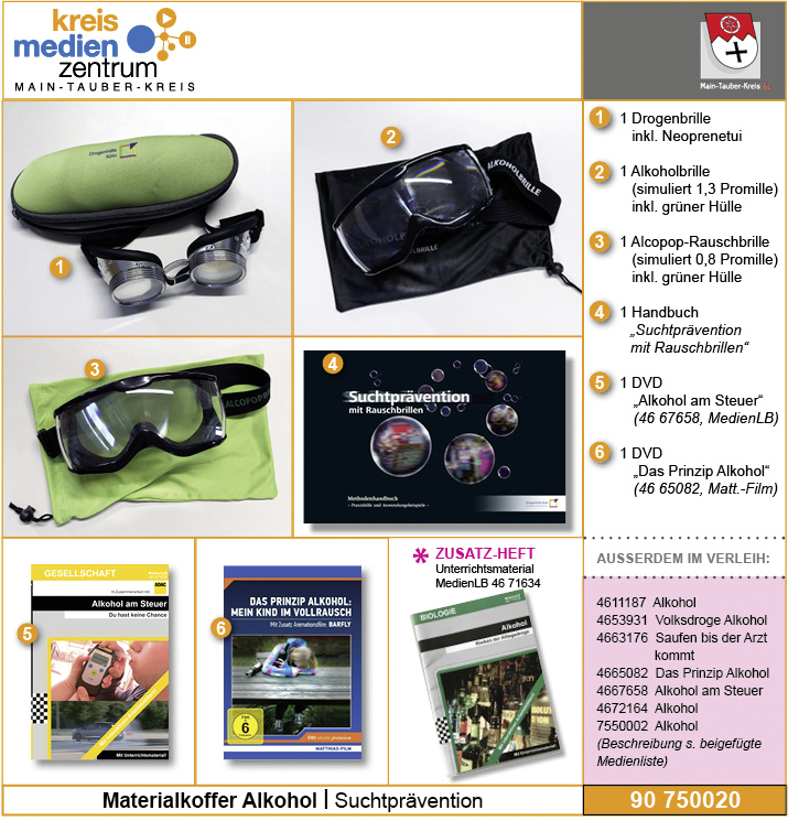 Suchtprävention in Schule und Jugendarbeit: Kinder und Jugendliche erfahren im nüchternen Zustand mit Hilfe der Simulation durch die Rausch-Brillen auf eindrucksvolle Weise die Wirkung von Alkohol und wie stark Alkoholkonsum die Wahrnehmung beeinträchtigt. Begleitend stehen ein Handbuch mit umfangreichen Übungen und Methoden zur Alkoholprävention sowie Filme für den Einsatz im Unterricht zur Verfügung. Inhalt: 3 RAUSCHBRILLEN: Drei Rauschbrillen (1 Alkoholbrille, 1 Alcopopbrille, 1 Drogenbrille) Die Rauschbrillen simulieren eindrucksvoll den Zustand der Beeinträchtigung durch Alkohol. Methodenhandbuch „SUCHTPRÄVENTION MIT RAUSCHBRILLEN“: Das von der Drogenhilfe Köln entwickelte Methodenhandbuch „Suchtprävention mit Rauschbrillen“ bietet Hintergrundinformationen und eine umfangreiche Methodensammlung zur Alkoholprävention. 3. überarbeitete Auflage, November 2017. 1 DVD „Alkohol am Steuer“ (46 67658, MedienLB) , 1 DVD „Das Prinzip Alkohol“ (46 65082, Matthias-Film)