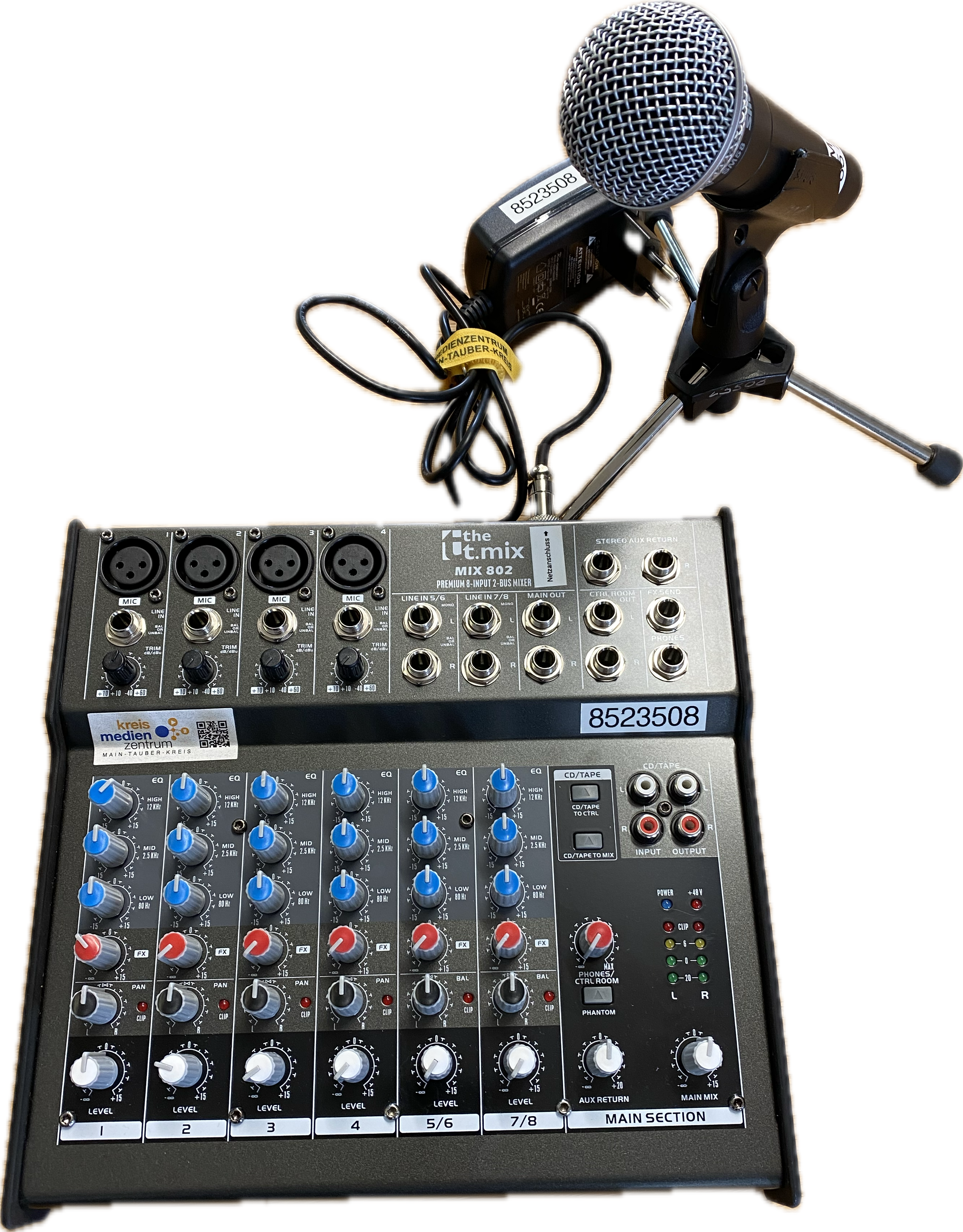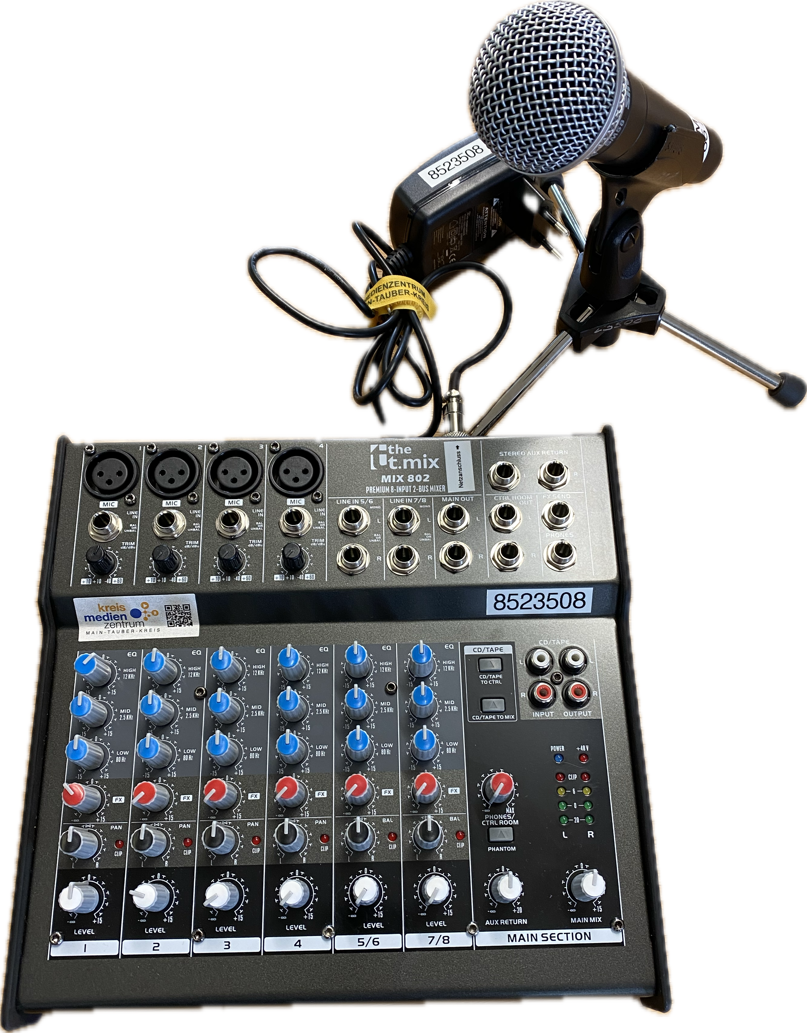 Mischpult "t.mix 802, Mikrofon SHURE SM58 im Lederbeutel, Mikrofonkabel, Netzteil, Verbindungskabel große Klinke-Cinch, Verbindungskabel kleine Klinke-Cinch, 2x Verbindungskabel große Klinke auf XLR, Tischstativ mit Mikrohalterung, 2 Bedienungsanleitungen