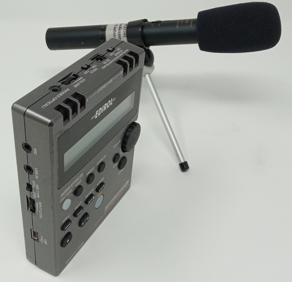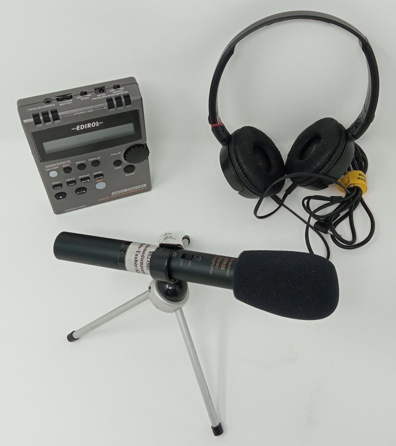 Digitalrecorder EDIROL R-1, Netzteil mit Kabel, USB Kabel, Mikrofonkabel 3 m, Kopfhörer, 1 GB-Karte (im Digitalrecorder), 1 Compact Flash-Karte 64 MB, 1 Tischstativ, 1 Mikrofon ATR25 mit Windschutz