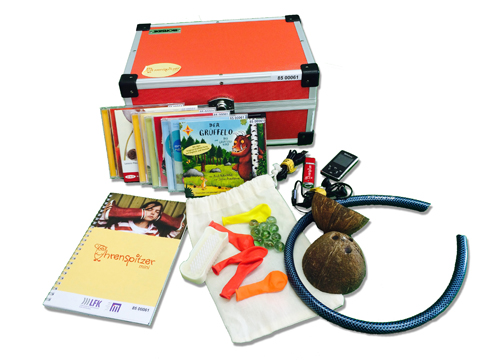 Inhalt: 6 Hörspiel-CDs ("Starke Freunde", "Dr. Brumm", "Mutig, mutig", "Wann gehen die wieder?", "Der Grüffelo", "Der fliegende Jakob"), 1x Beutel Murmeln, Luftballons, Bürste, 1x Beutel MP3-Player, Ear-Phones, USB-Kabel, USB-Stick, Anleitung, 1x Beutel Kokosschalen & Schlauch, 1x Infobroschüre, 1x Geräuschrezepte, 2x Booklets Hörbogen