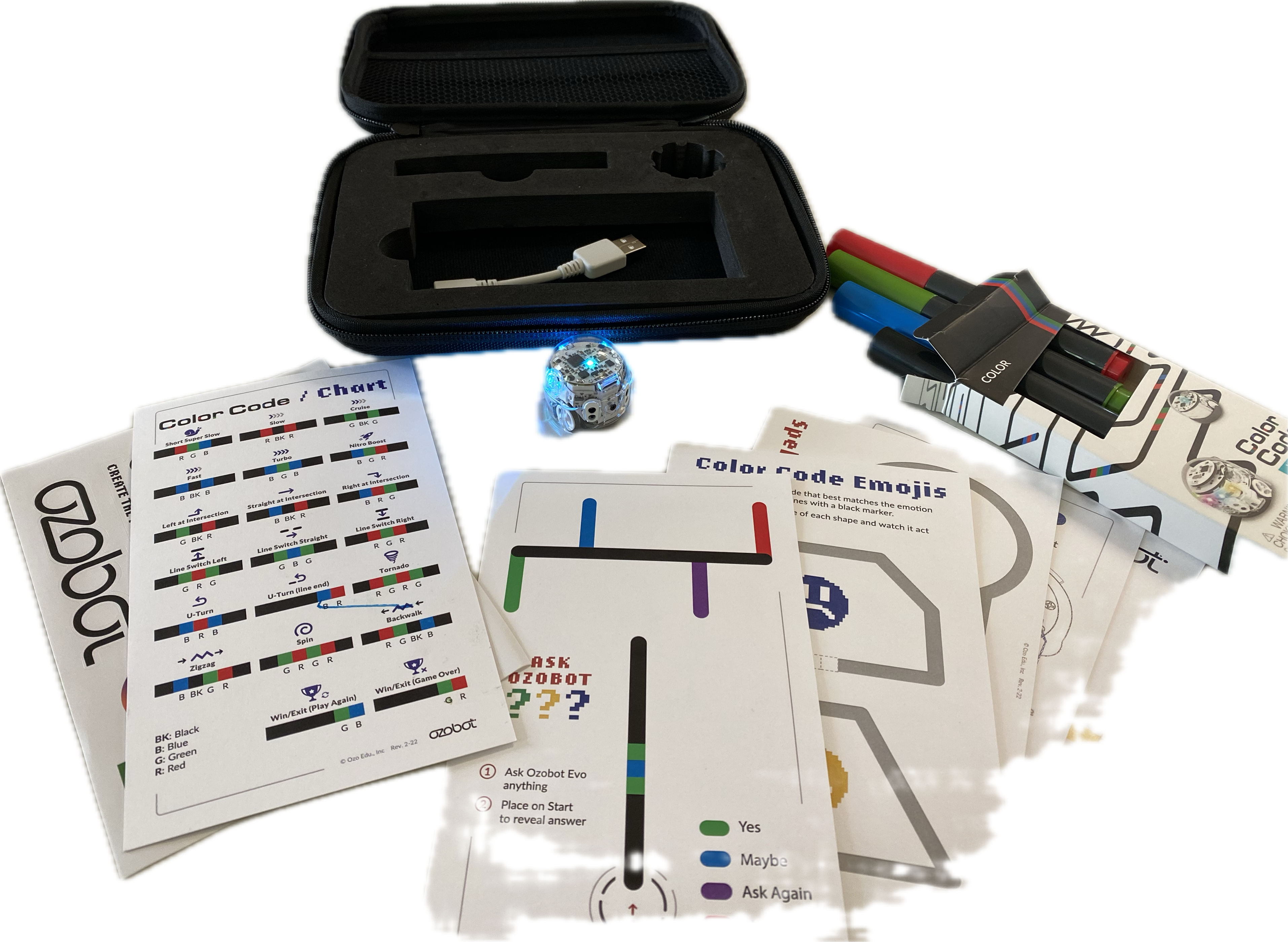 Der Ozobot kann durch das Zeichnen von Linien programmiert werden. Einer einfachen schwarzen Linie folgt der Bot zielstrebig. Mithilfe der drei Farben rot, blau und grün können Farbcodes erstellt werden, die der Ozobot in zahlreiche Befehle, wie Drehungen, Zickzackkurse sowie verschiedene Geschwindigkeiten umsetzen kann.