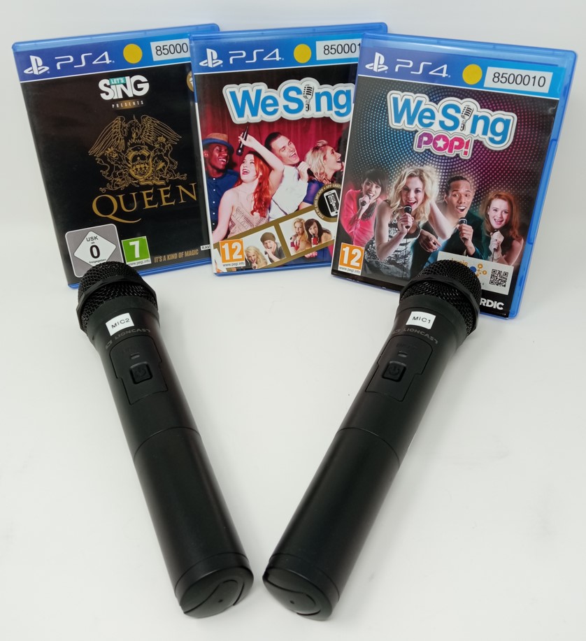 Zusätzlich gibt es noch eine Zubehör-Box: 2x Wireless-Mikrofon mit je 2 Akkus und 2 x USB-A-Dongle, 1 Anleitung, 3 CD's: Queen, WeSing und WeSing POP
