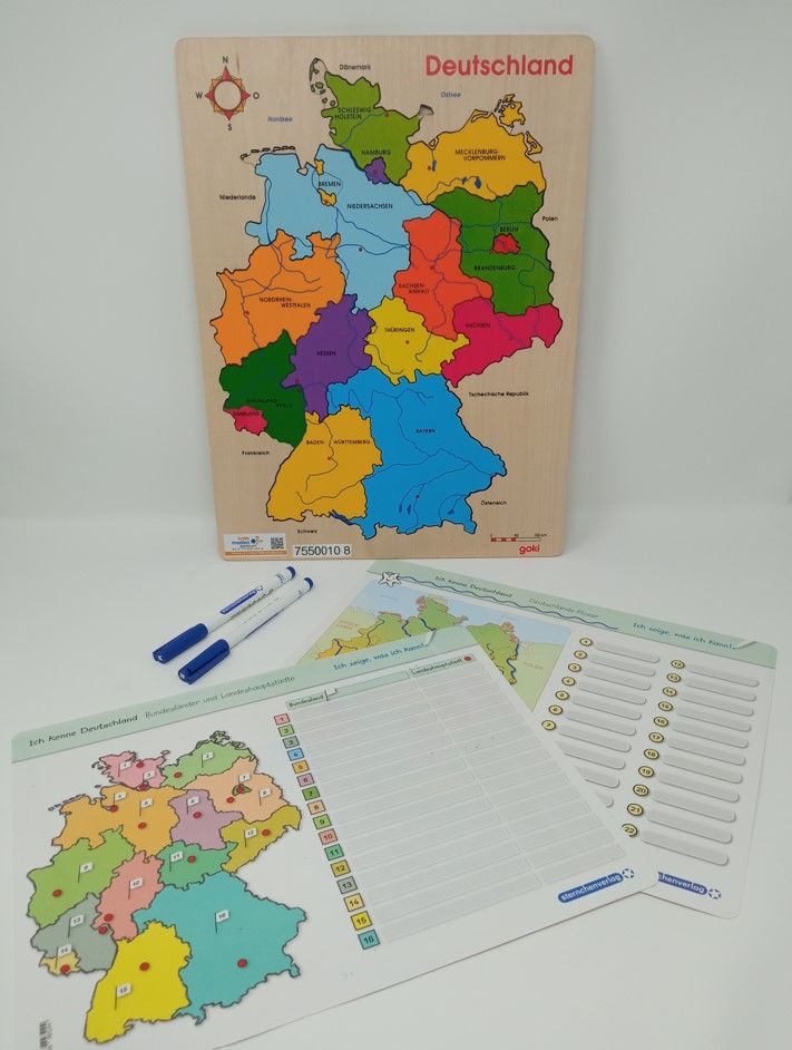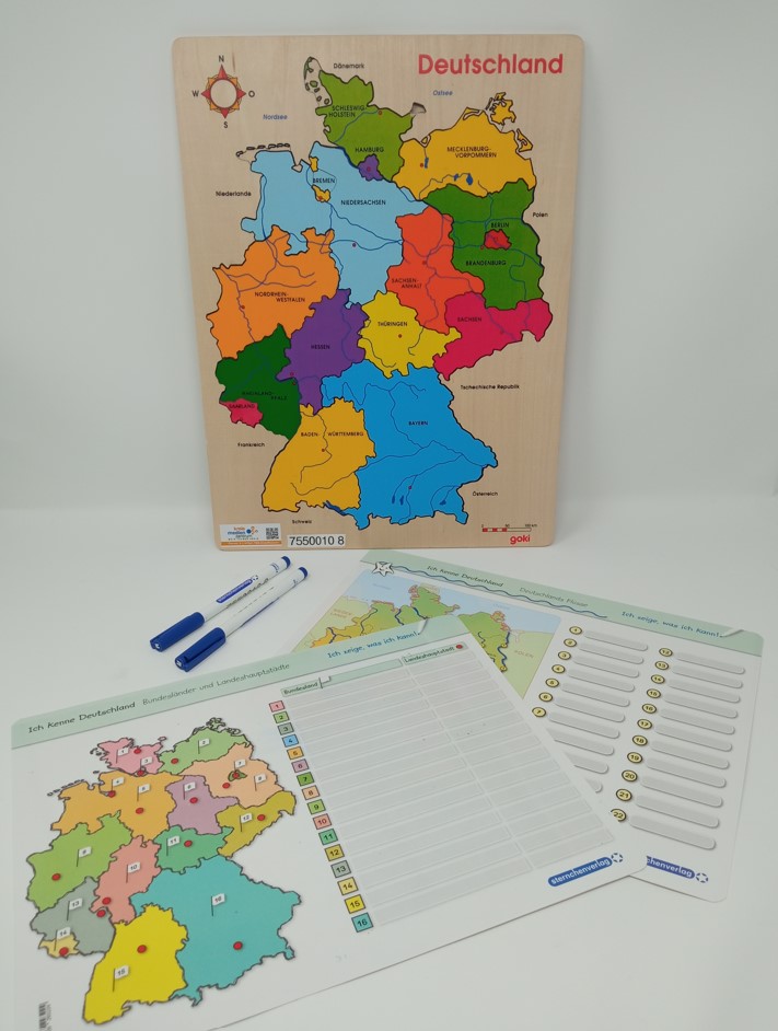 Set mit 1 Puzzle und 2 Karten. Einlegepuzzle aus Holz mit den deutschen Bundesländern und ihren Hauptstädten mit ihrer Lage (16 Teile). Deutschlandkarte mit 22 Flüssen. Deutschlandkarte mit 16 Bundesländer und deren Hauptstädte. Wiederbeschreibbare Lernvorlagen (Vorder- und Rückseite) mit Spezialstift, trocken abwischbar.