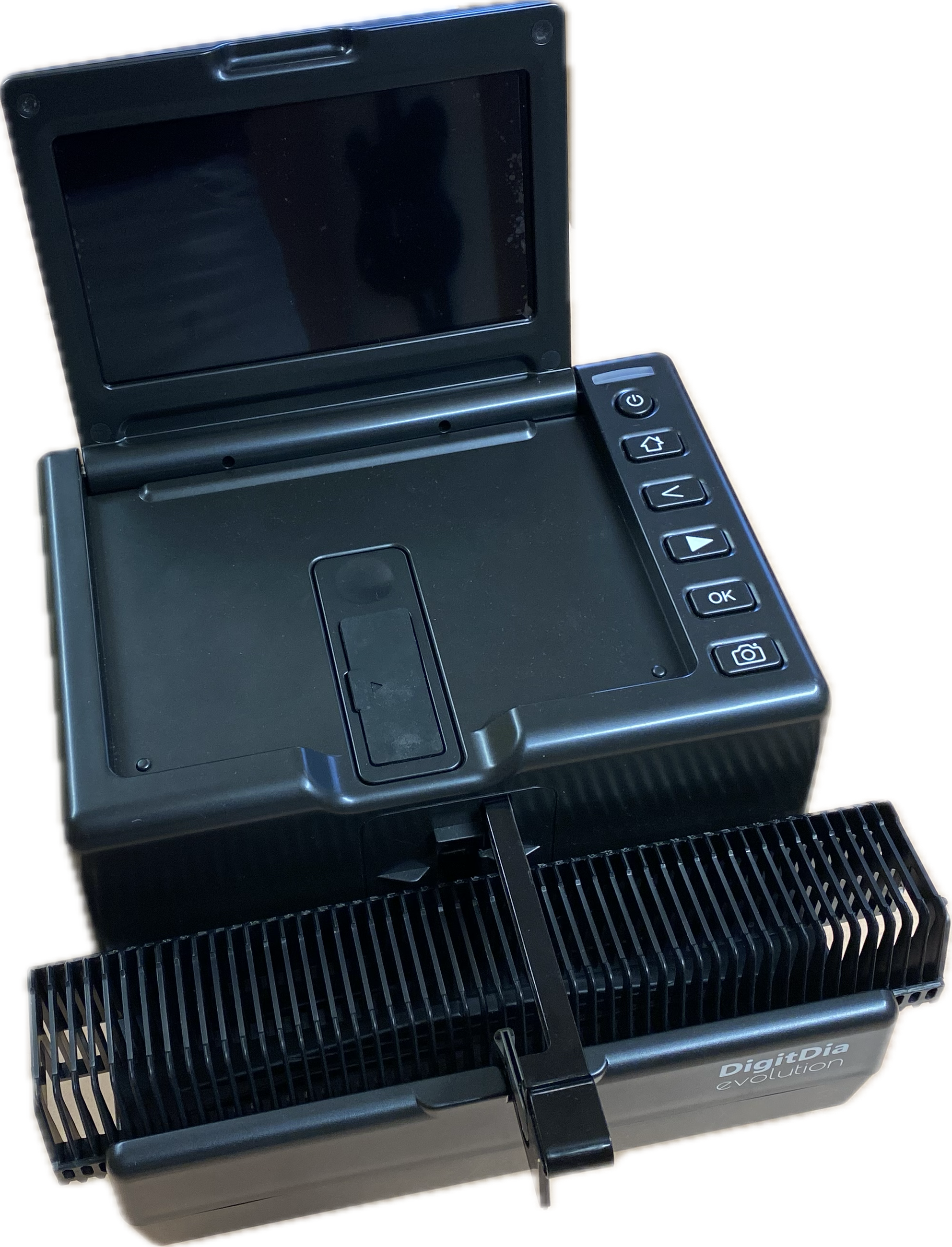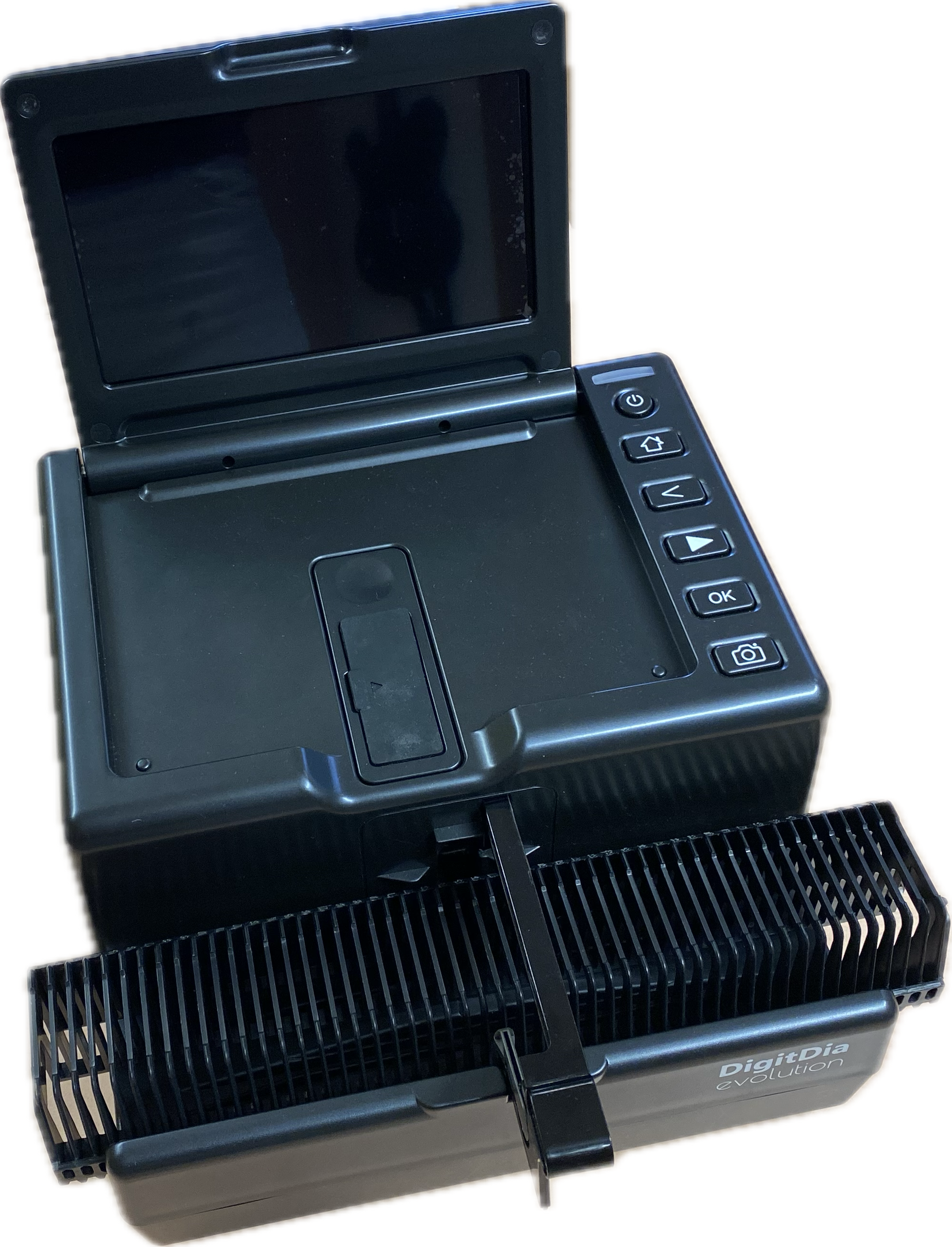 Mit dem DigitDia evolution können Sie ihr gesamtes Diaarchiv direkt aus den Magazinen betrachten und digitalisieren. Das computerunabhängige Gerät ist sehr einfach zu bedienen. Wie bei einem herkömmlichen Diaprojektor werden die Dias unmittelbar nach dem Einschieben ins Gerät wiedergegeben. Dies geschieht auf einem brillanten IPS-Display, das im Gerät integriert ist. Optional können Sie auch einen externen Monitor, ein Fernsehgerät oder einen Projektor mit HDMI-Ausgang des DigitDia anschließen. Somit ist auch eine klassische Dia-Schau wieder möglich. Sowohl Wiedergabe als auch Digitalisierung der Dias können manuell oder automatisch erfolgen. Das automatische Scannen eines ganzen Magazins mit 50 Dias erfolgt in nur 4 Minuten in bester Auflösung, wobei die digitalen Bilder direkt auf einer SD-Karte gespeichert werden.