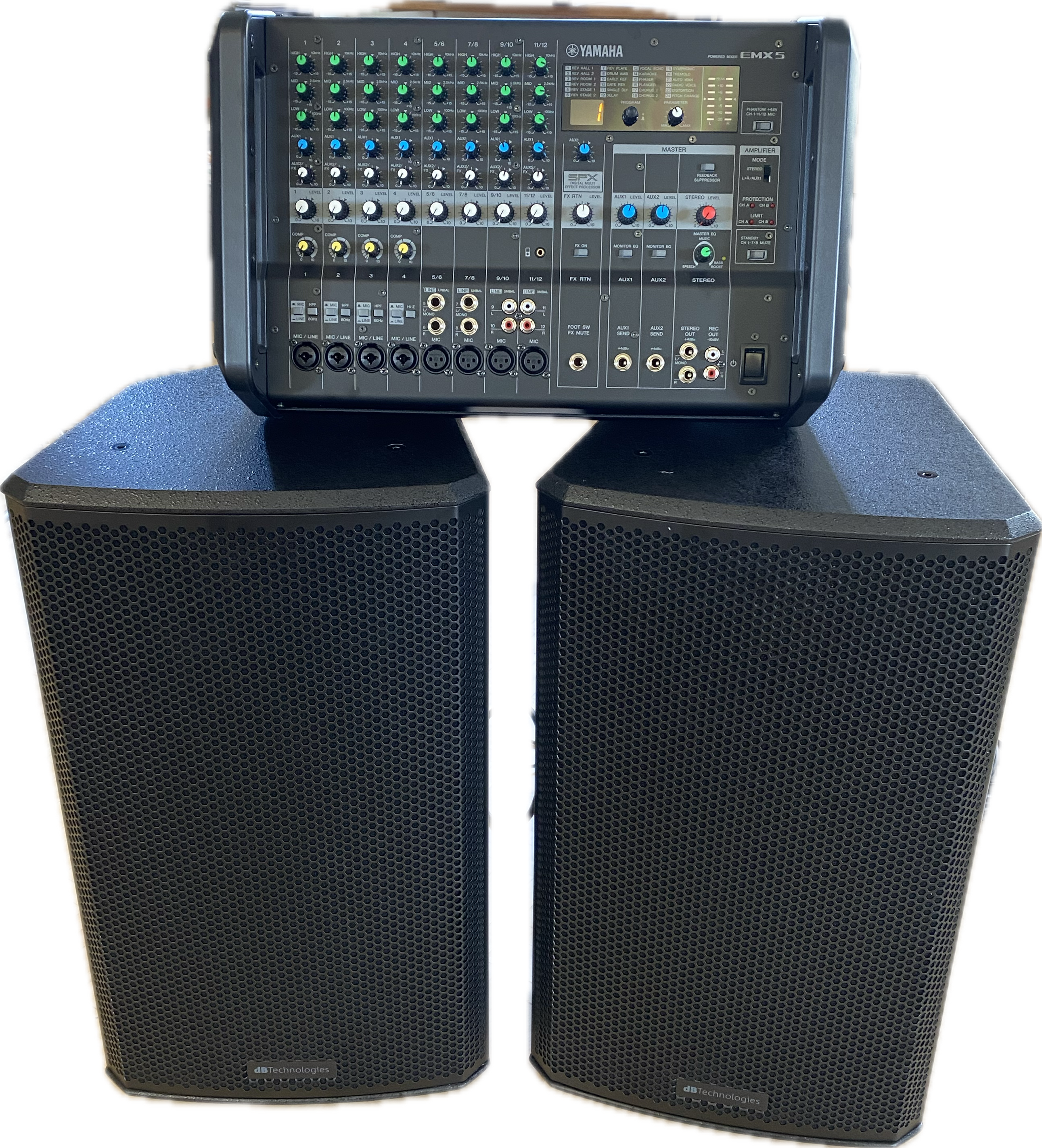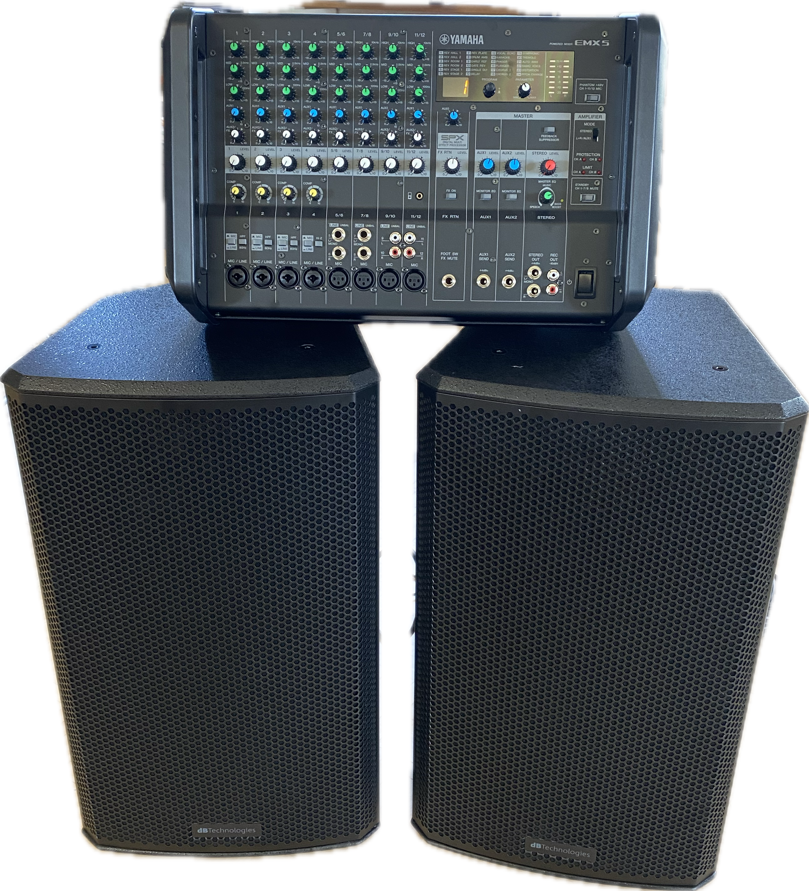 Diese professionelle Soundanlage besteht aus dem Yamaha Mixer EMX5 und zwei dB Technologies LVX P12 Lautsprechern und bietet eine leistungsstarke und flexible Lösung für verschiedenste Beschallungsanforderungen – von Live-Auftritten über Präsentationen bis hin zu Veranstaltungen jeder Art.