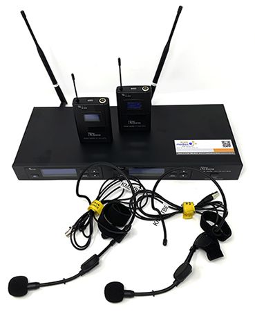 Das Funkset besteht aus zwei Taschensendern und stationärem Doppel-Empfänger. Die Taschensender des Drahtlos-Sets sind mit einem Display ausgestattet, sodass ihre Bedienung einfach und übersichtlich ist.