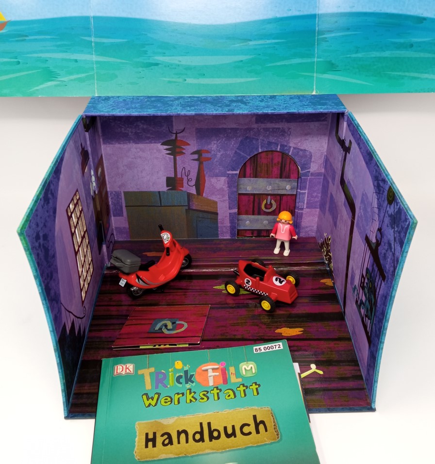 Box mit mehreren Schauplätzen und Spielfiguren zum Erstellen von Trickfilmen.