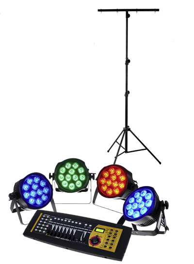4 Typhoon PAR Outdoor 12 x 10W LED Strahler, Transportcase, 2 Lichtstative mit Quertraverse, Stativtasche, 2 DMX 3 Pol Kabel (20m), 2 DMX 3 Pol Kabel (2m), Lichtsteuergerät Stairville DMX-Master mit Koffer