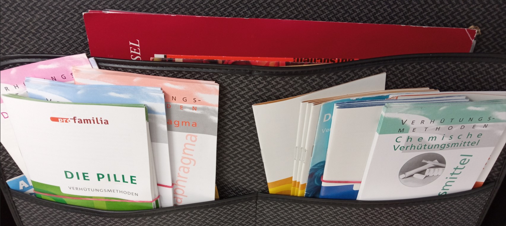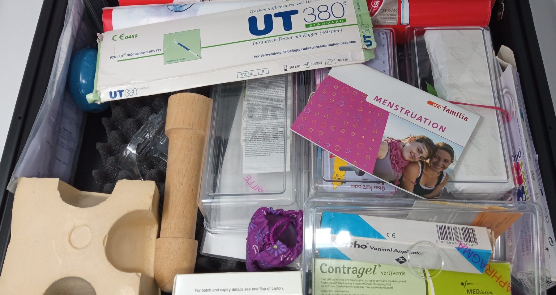 Inhalt des Verhütungsmittelkoffers: Kondome; Holzpenis zur Demonstration; Diaphragma; Gebärmuttermodell (für Diaphragma); Portiokappe; Kondom für die Frau (Femidom); Spirale; Pillenpackung mit Infomaterial; Verhütungsmittelstäbchen; Verhütungsring; Spekulum; Schwangerschaftstest; Hinweise zur Anwendung des Koffers; Broschüren.